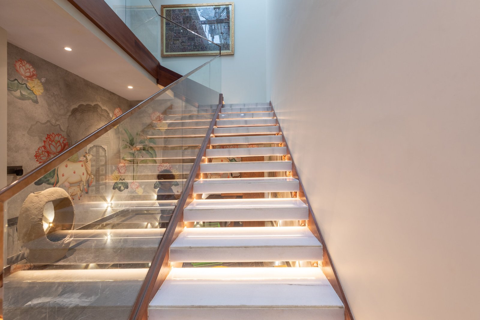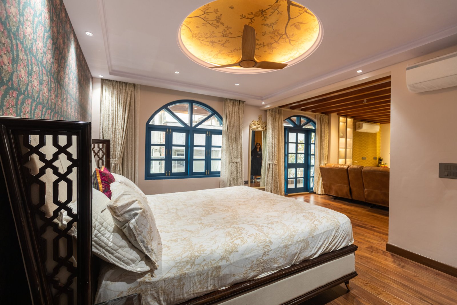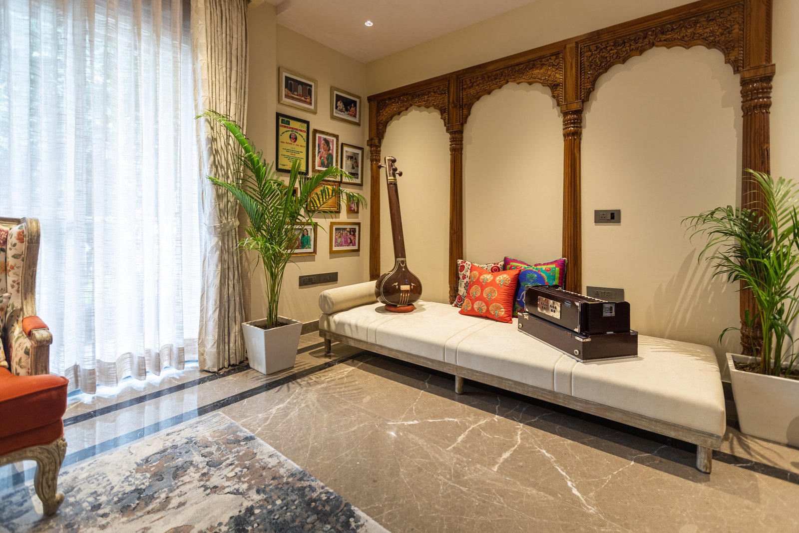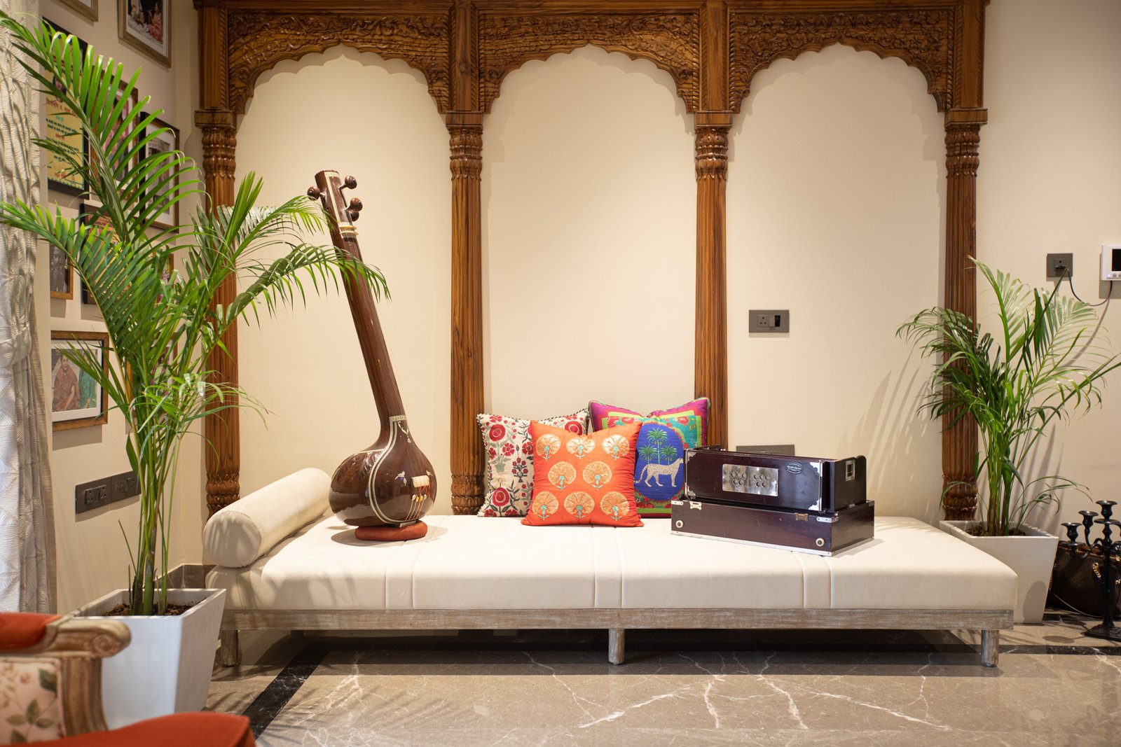 Modern Abode is a home that brings the soul of Benares into the heart of Gurugram. Spread across 18,000 sq ft in the quiet lanes of DLF Phase IV, this residence is a poetic dialogue between cultural heritage and contemporary living. Bespoke teakwood arches reminiscent of Rajasthan forts frame the riaaz area, while paintings of ghats and Tanjore by the homeowner add a deeply personal legacy of Indian artistry. Natural materials—stone, lime plaster, warm wood, cotton, silk, and wool—anchor the design, creating an atmosphere that feels both grounded and luxurious. It is a home where heritage is not preserved as nostalgia but lived in with serenity and belonging
