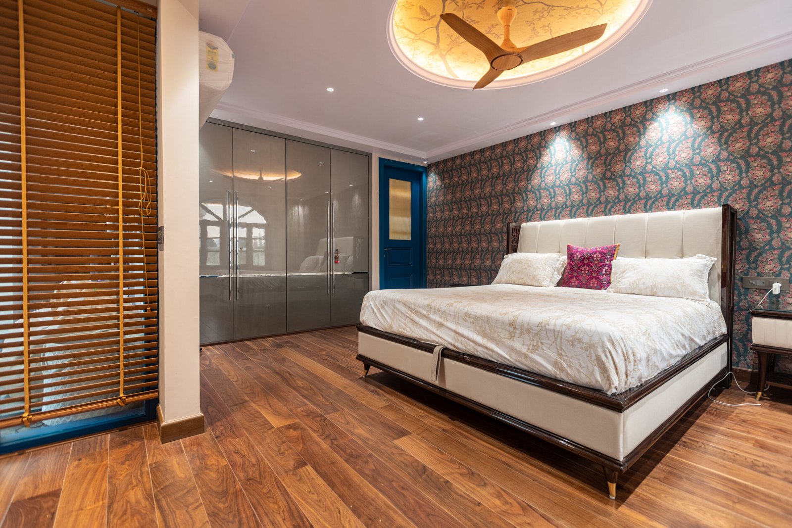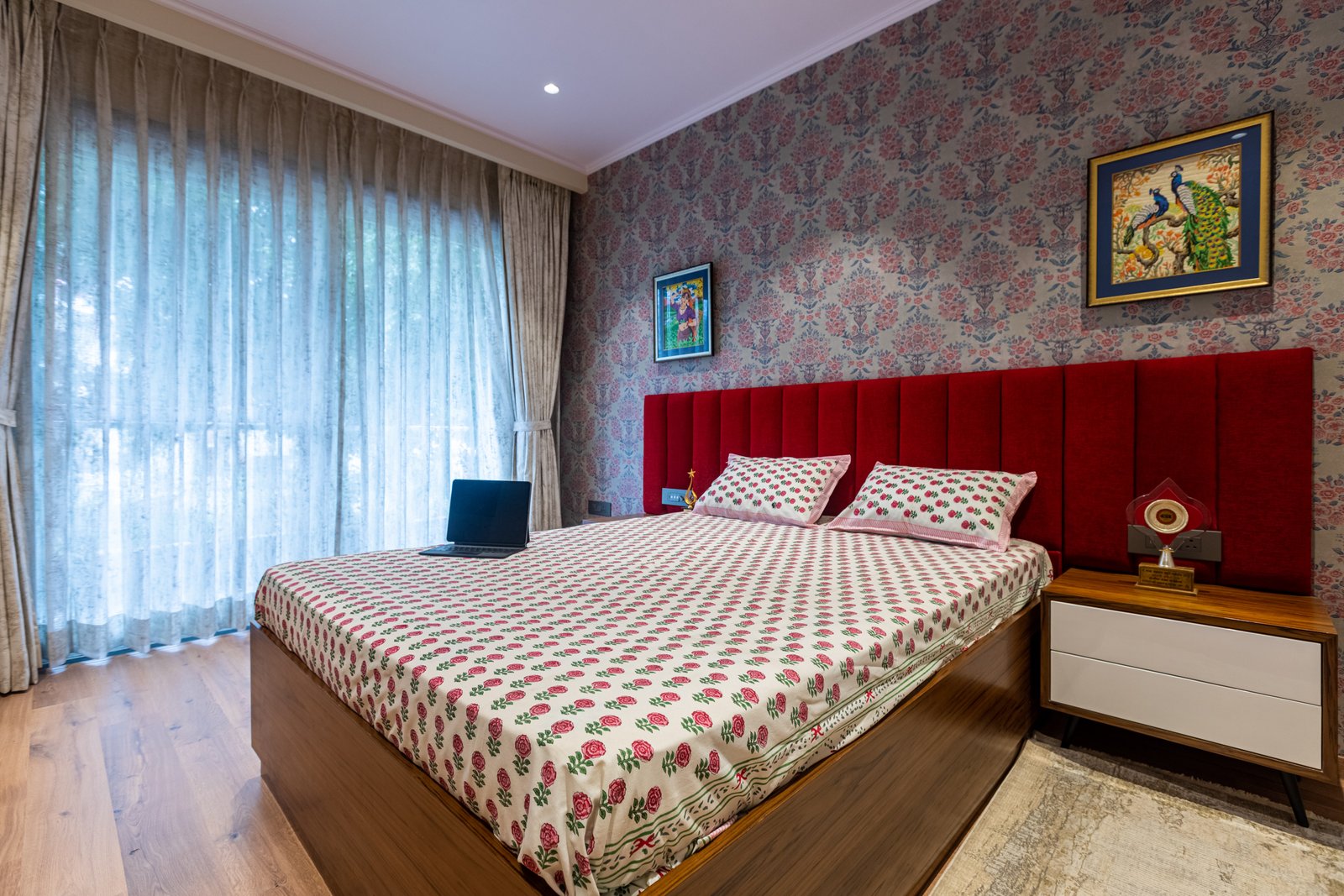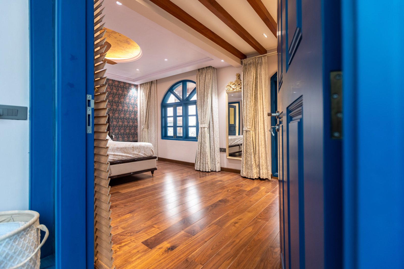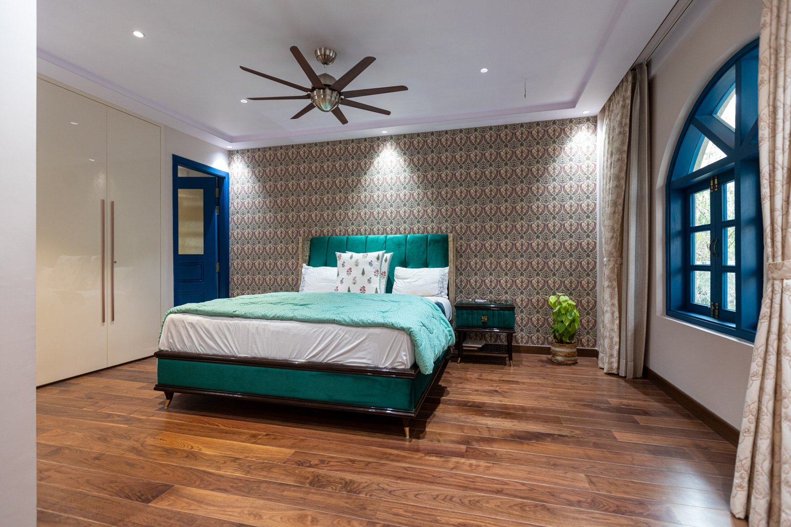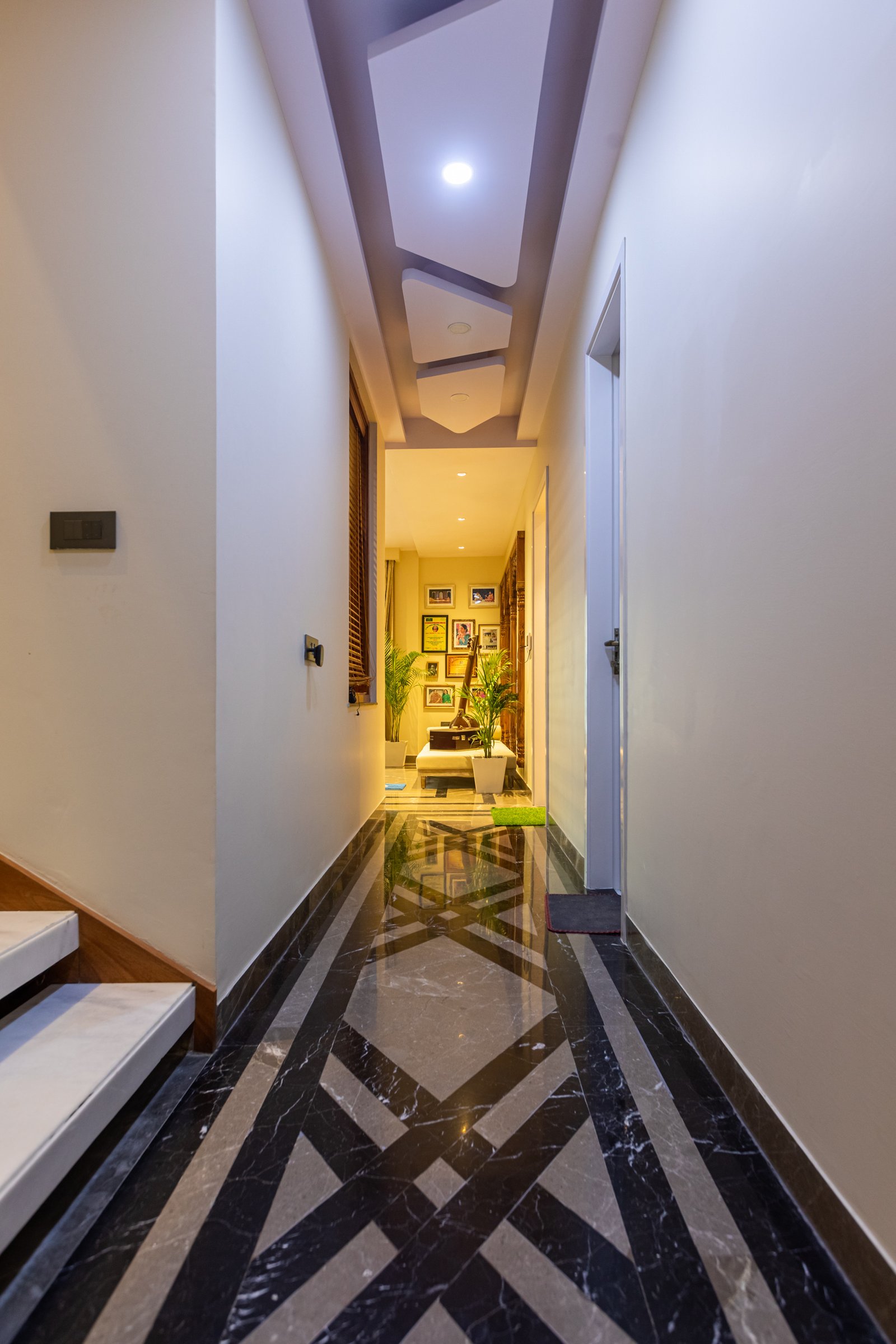 Modern Abode is a home that brings the soul of Benares into the heart of Gurugram. Spread across 18,000 sq ft in the quiet lanes of DLF Phase IV, this residence is a poetic dialogue between cultural heritage and contemporary living. Bespoke teakwood arches reminiscent of Rajasthan forts frame the riaaz area, while paintings of ghats and Tanjore by the homeowner add a deeply personal legacy of Indian artistry. Natural materials—stone, lime plaster, warm wood, cotton, silk, and wool—anchor the design, creating an atmosphere that feels both grounded and luxurious. It is a home where heritage is not preserved as nostalgia but lived in with serenity and belonging