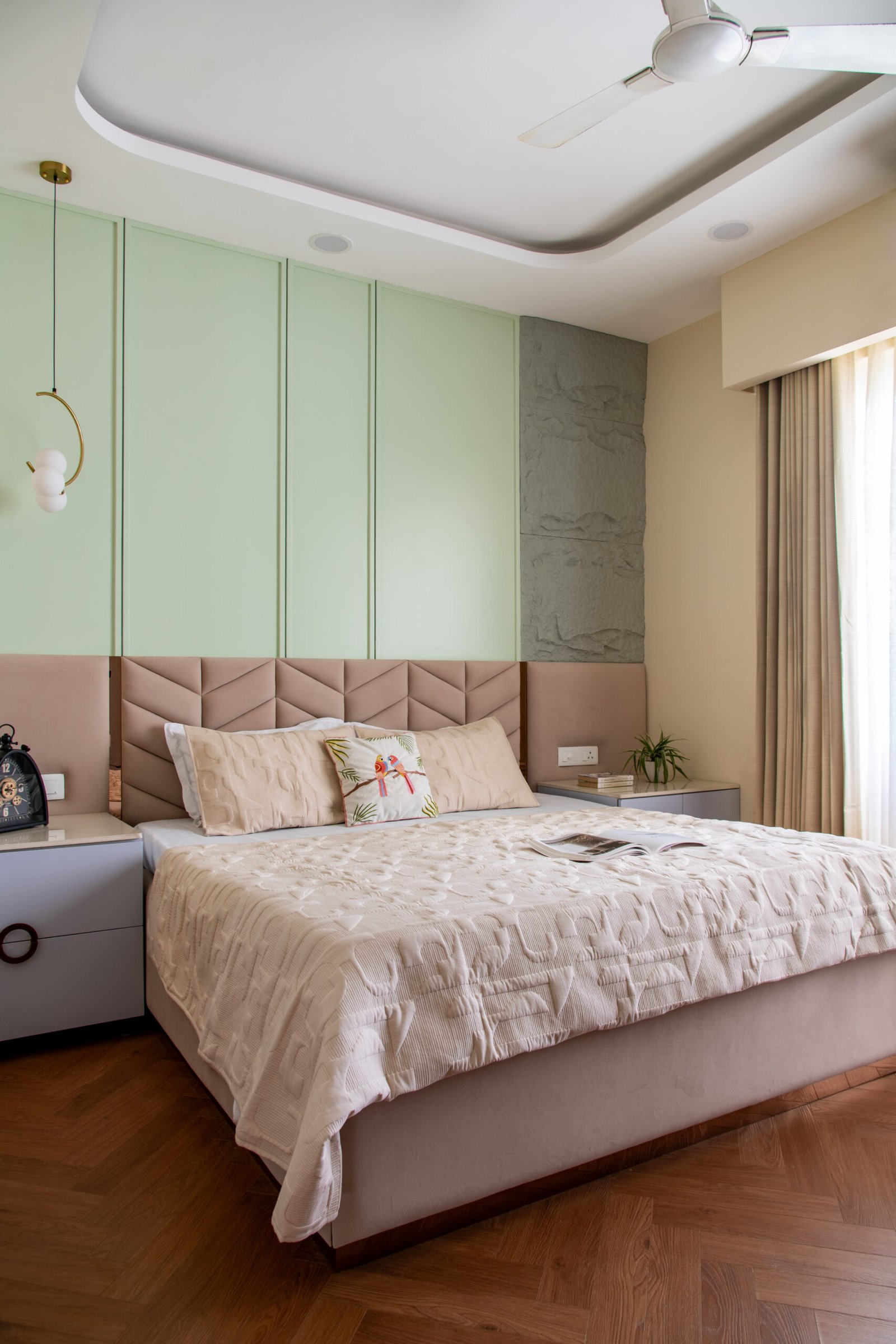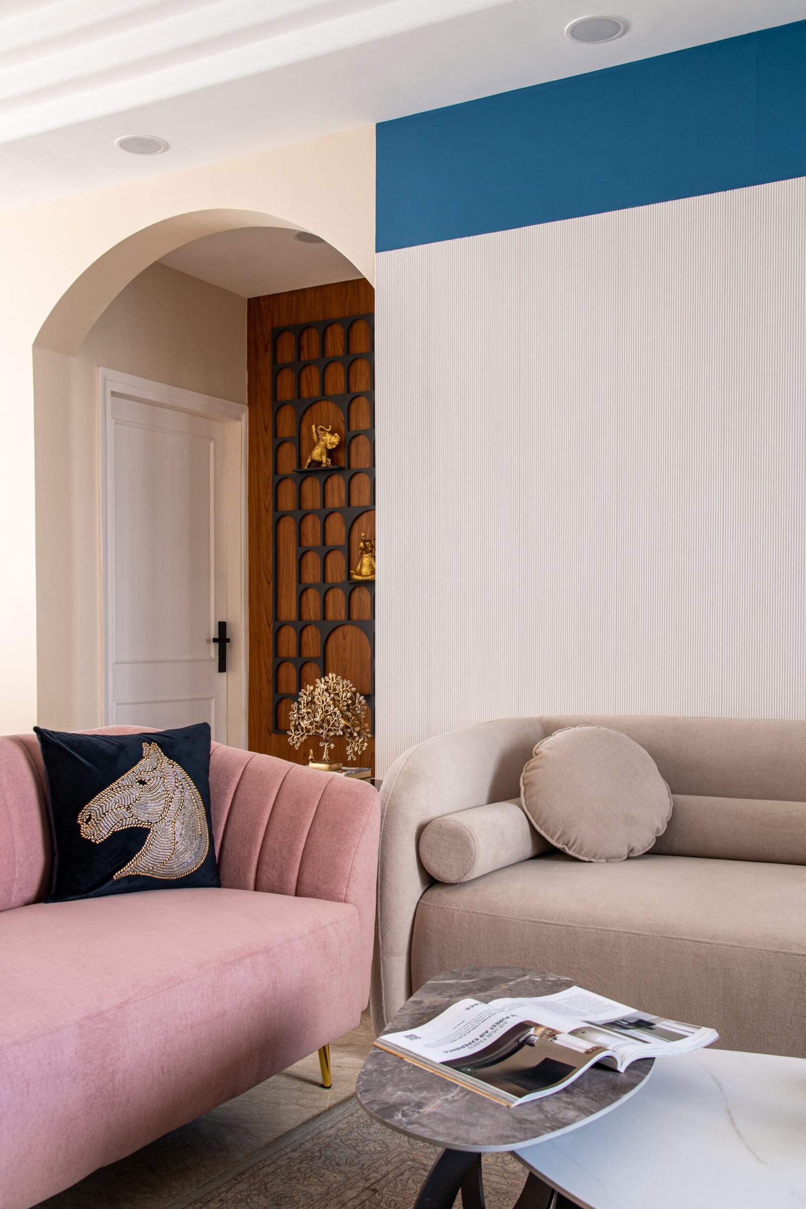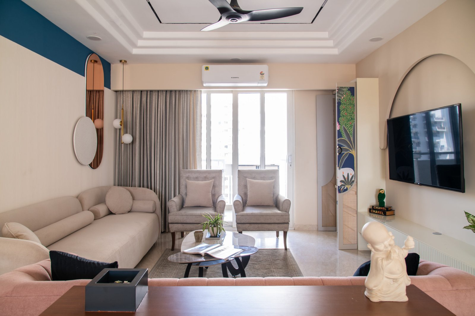 This home was designed for a young couple and their extended family across three generations — a calm, modern refuge that still feels deeply human. Soft pastels in blush and beige create a soothing backdrop, while subtle gold accents add a quiet sense of luxury. Rooms are layered with tactile textures and pared-back forms so the interiors read chic yet inviting; natural light filters through every corner, and the parents’ bedroom becomes a nurturing cocoon of comfort and style. The children’s room is playful and practical — an aviation mural, rounded-edge furniture and clever storage make it a creative sanctuary that grows with the child