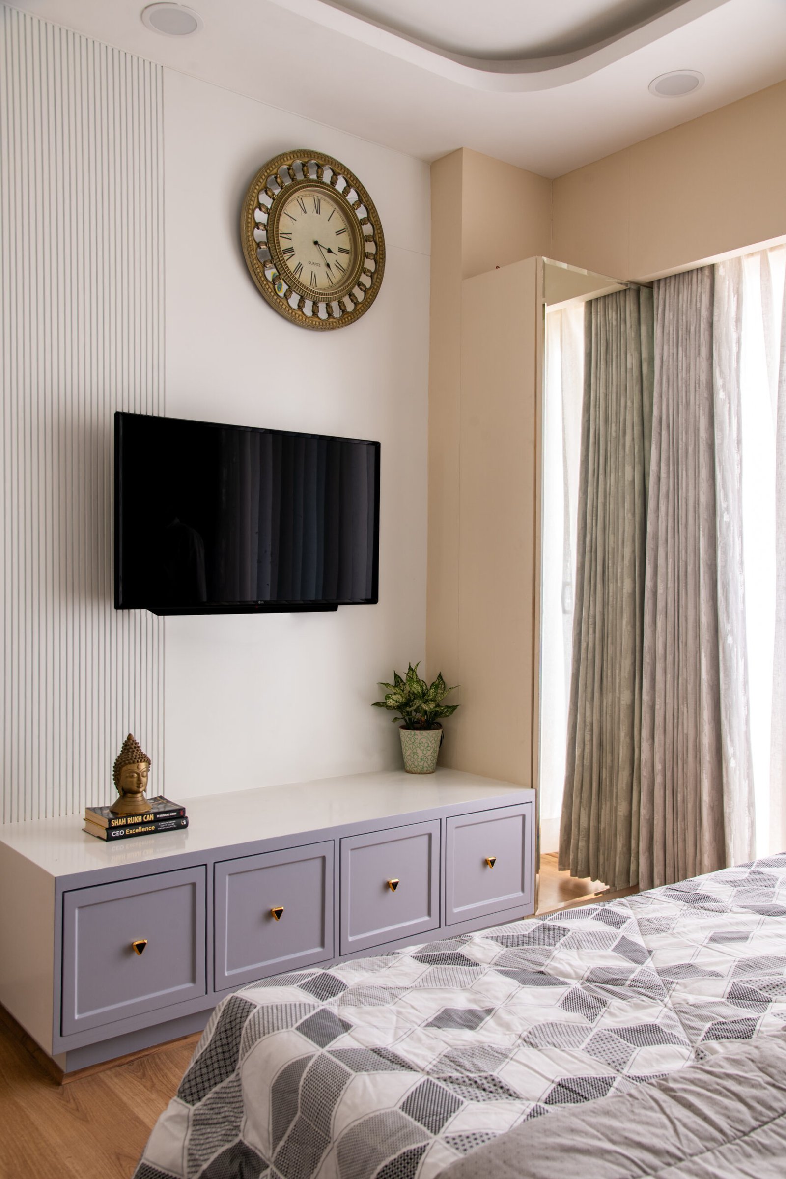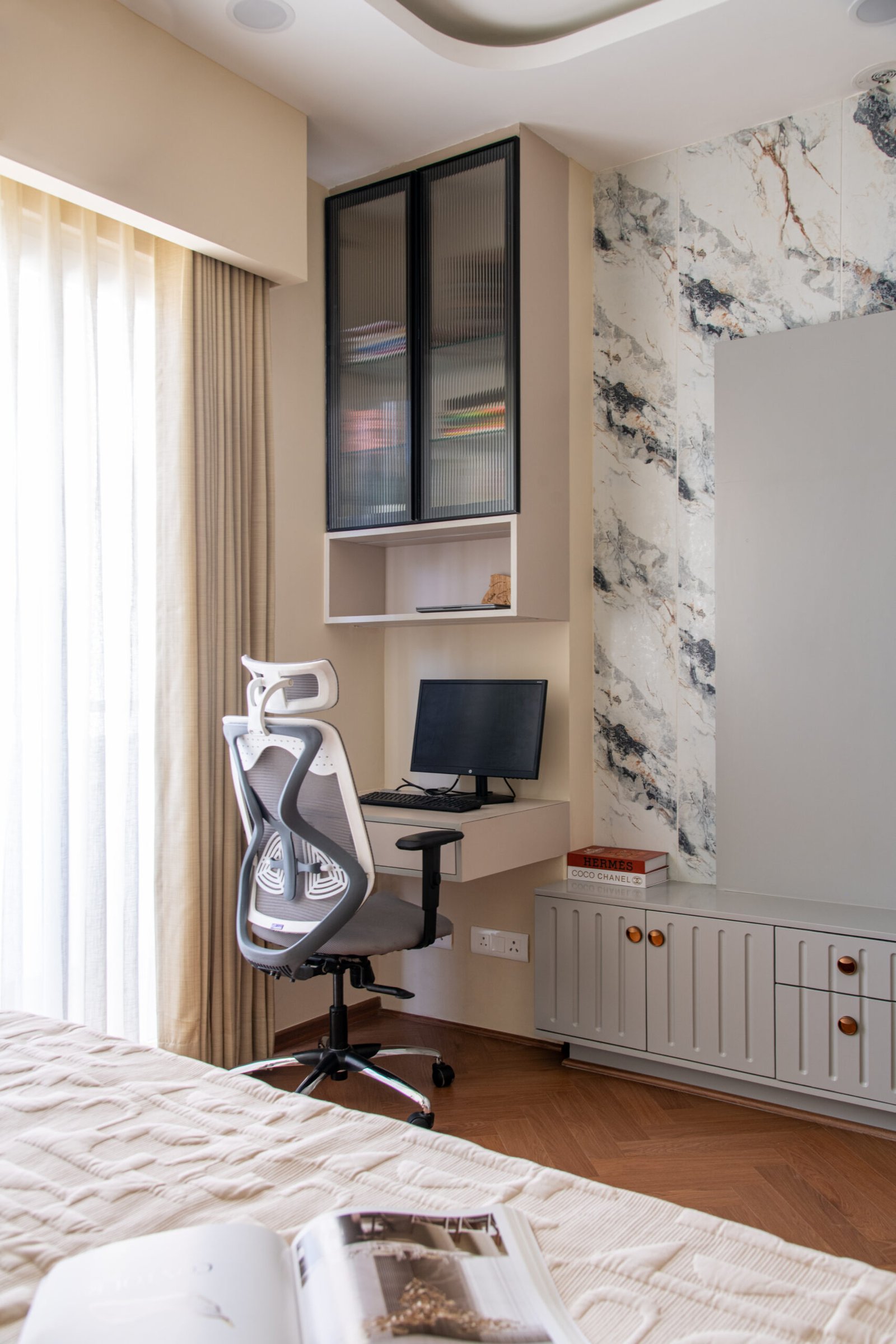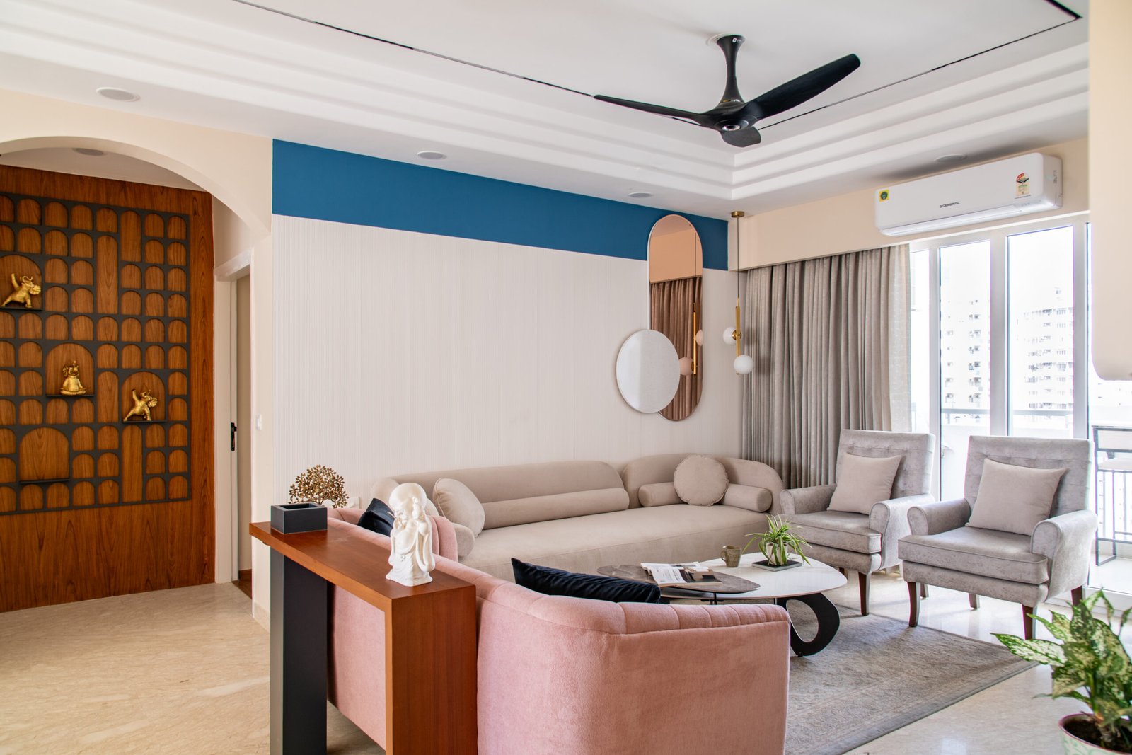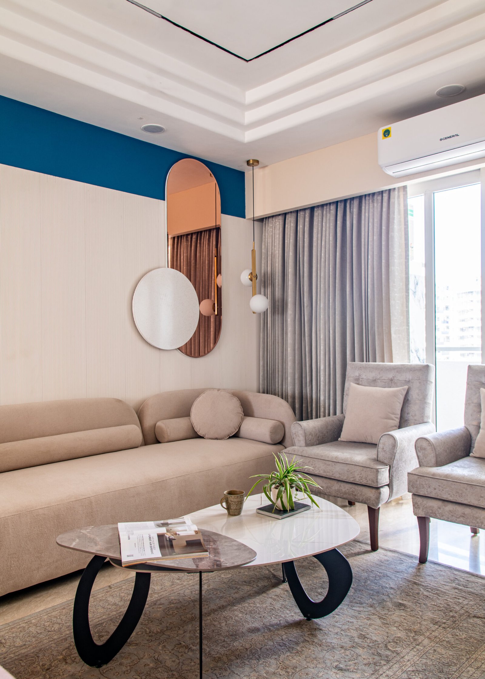 This home was designed for a young couple and their extended family across three generations — a calm, modern refuge that still feels deeply human. Soft pastels in blush and beige create a soothing backdrop, while subtle gold accents add a quiet sense of luxury. Rooms are layered with tactile textures and pared-back forms so the interiors read chic yet inviting; natural light filters through every corner, and the parents’ bedroom becomes a nurturing cocoon of comfort and style. The children’s room is playful and practical — an aviation mural, rounded-edge furniture and clever storage make it a creative sanctuary that grows with the child